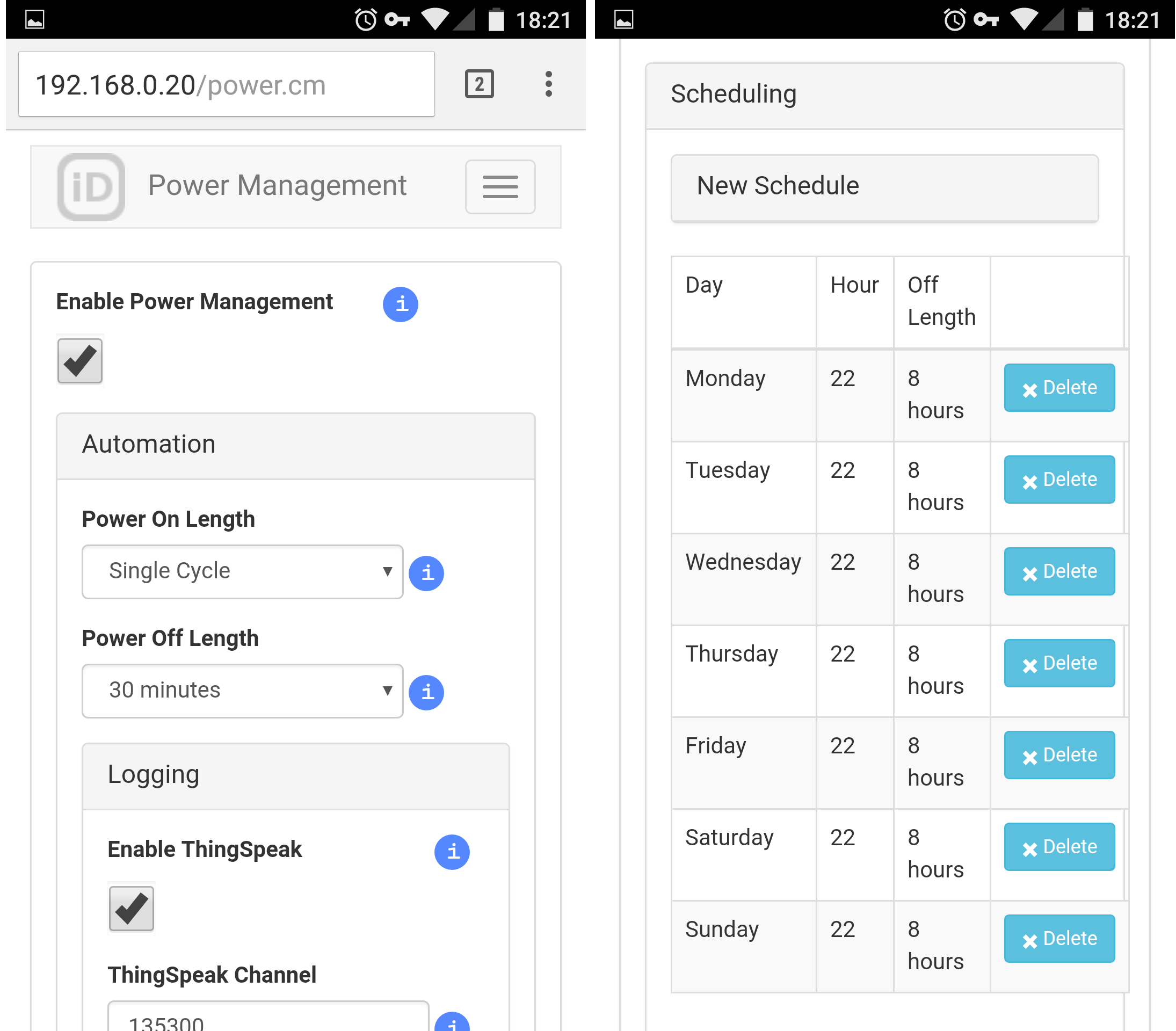 - A scheduled deep sleep feature to work in combination with NTP supplied time. This would enable long sleep periods at specific times of the day on specific days of the week e.g. sleep at 22:00 on Tuesday for 8 hours.
