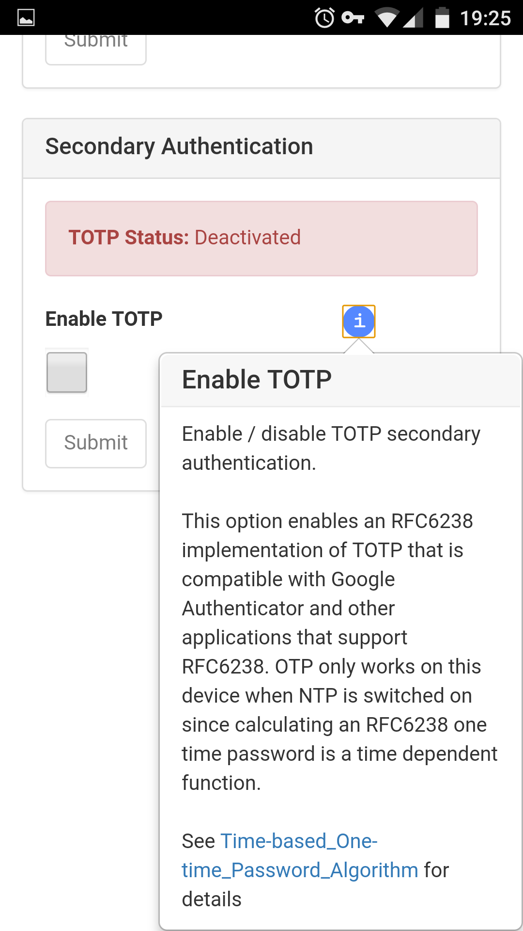 So to calculate an RFC6238 OTP, you need a secret key (really secret, don’t divulge it to anyone) and accurate time wherever you’re calculating the OTP. The Google Authenticator app runs on a smartphone so it has an accurate view of the time so long as the time is correct on the phone. To calculate an OTP on an ESP8266 device, you need either NTP time enabled or some other method of accurately determining the time.