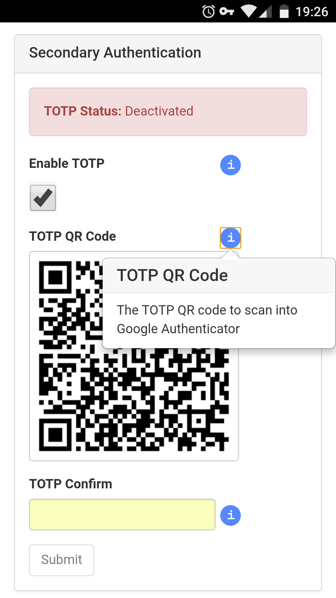 Update #1: Github user ccoenen was correct to highlight in issue #1 that it really was a bad idea to depend on / make a request to chart.googleapis.com to render a QR code for the secret key for subsequent scanning into Google Authenticator. This issue is now fixed.